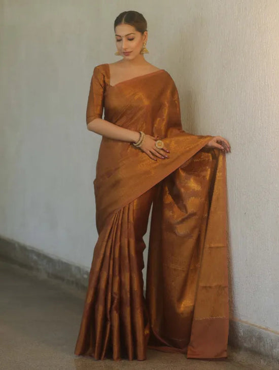 Drape yourself in refined elegance with this Luxe Golden Brown Georgette Saree, masterfully crafted with subtle zari detailing for a graceful sheen and timeless appeal. The lightweight georgette fabric flows beautifully, offering an effortless drape, while the soft golden brown hue and understated patterns make this saree a versatile choice for any festive, party, or wedding occasion.