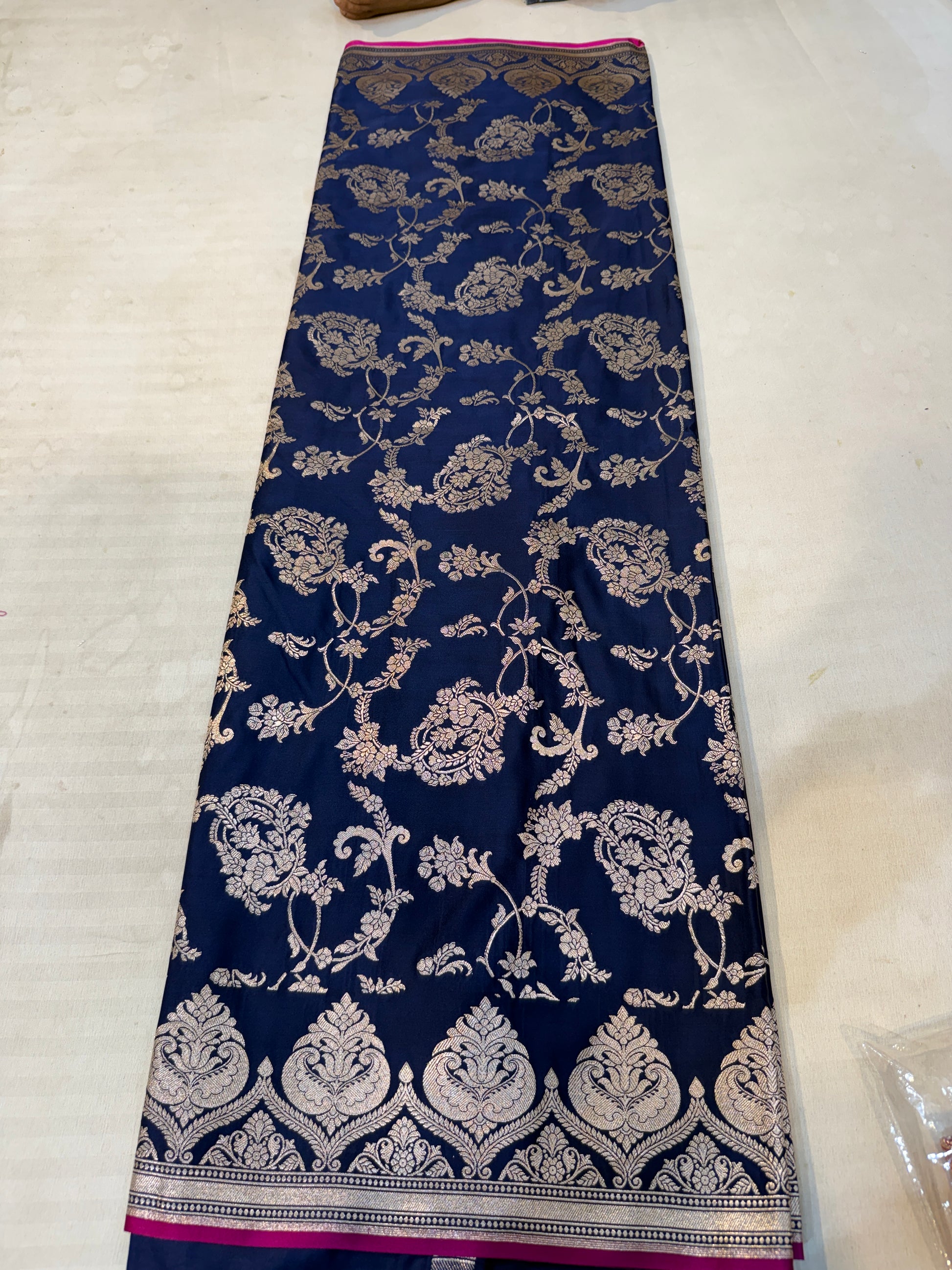 Design: Mughal-inspired floral motifs and signature Banarasi jhallar border