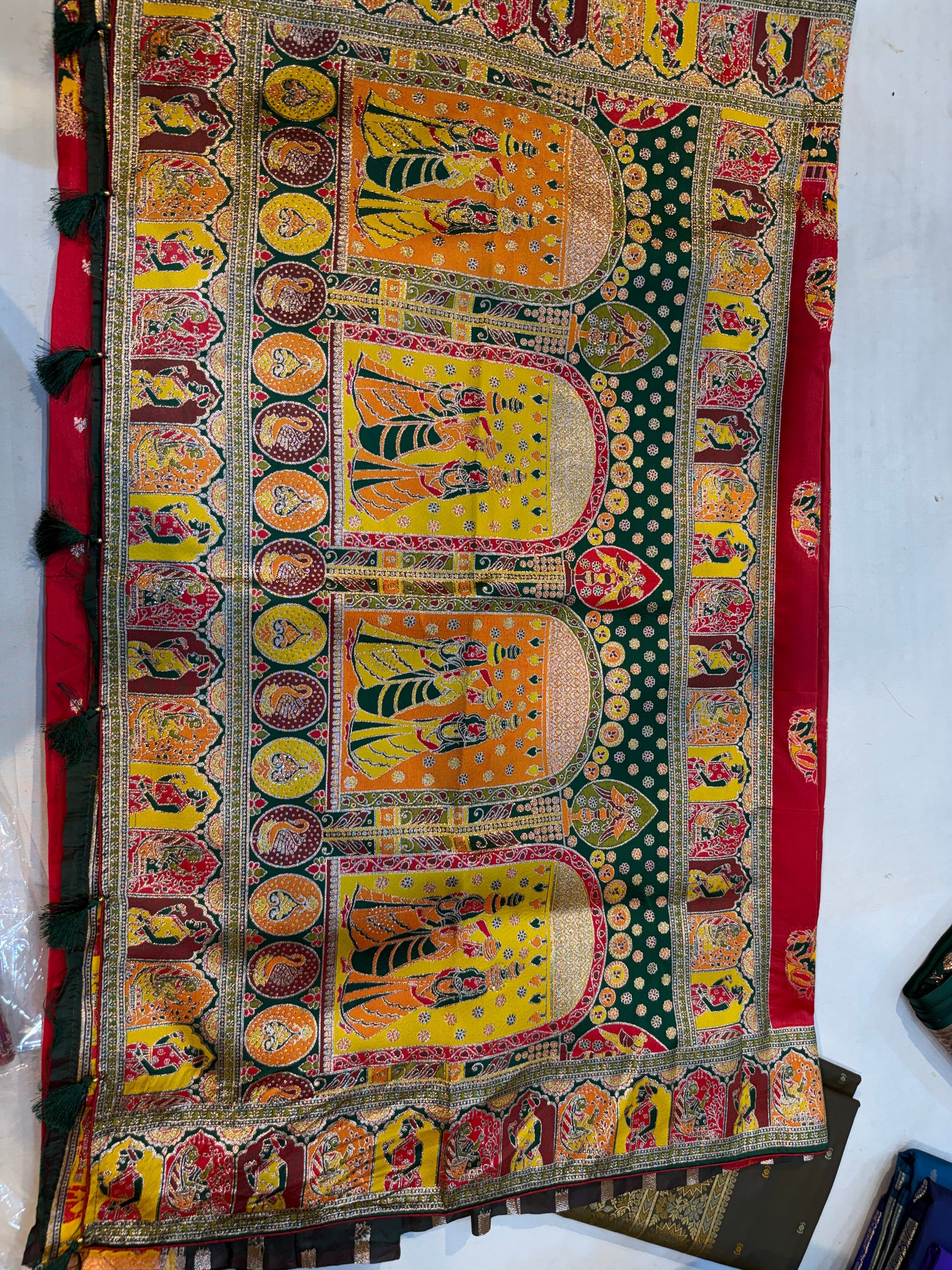 Design: Mythological story motifs, intricate temple arches, and ornamental woven accents
