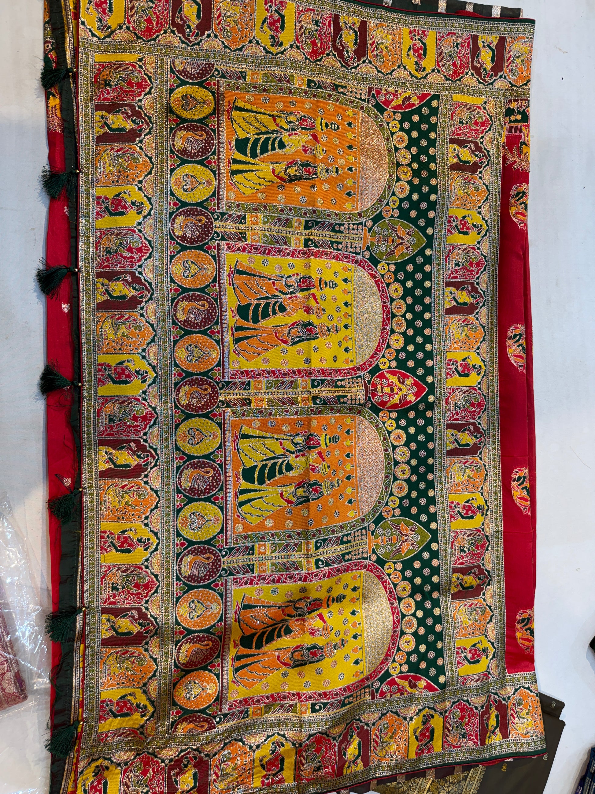 Drape yourself in the exquisite heritage of India with this classic Tassar silk saree, revered for its natural golden sheen, richly textured fabric, and vibrant artistry. Crafted by skilled artisans, this saree showcases magnificent handwoven mythological and nature-inspired motifs, presented in hues of yellow, green, and red, and highlighted by traditional intricate borders. The tapestry-like design features detailed human figures in temple arches, leafy patterns, and ornamental accents, all woven using age-old handloom traditions that add a museum-like visual depth to both sides of the saree.